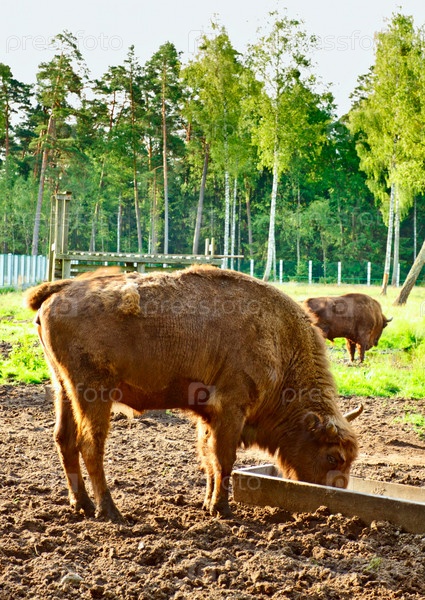 Зубры едят в заповеднике