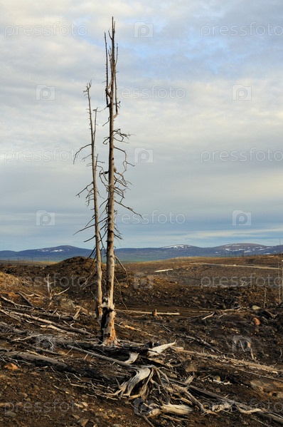 Мертвые деревья рядом с металлургическими заводами. Последствия неблагоприятных экологических условий