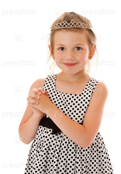 Счастливая шестилетняя девочка в платье, изолирована на белом