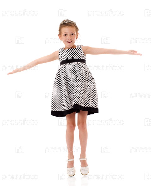 Прыгающая шестилетняя девочка в платье и диадеме, изолирована на белом