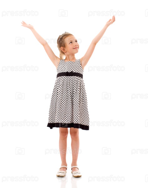 Счастливая шестилетняя девочка в платье и диадеме, изолирована на белом
