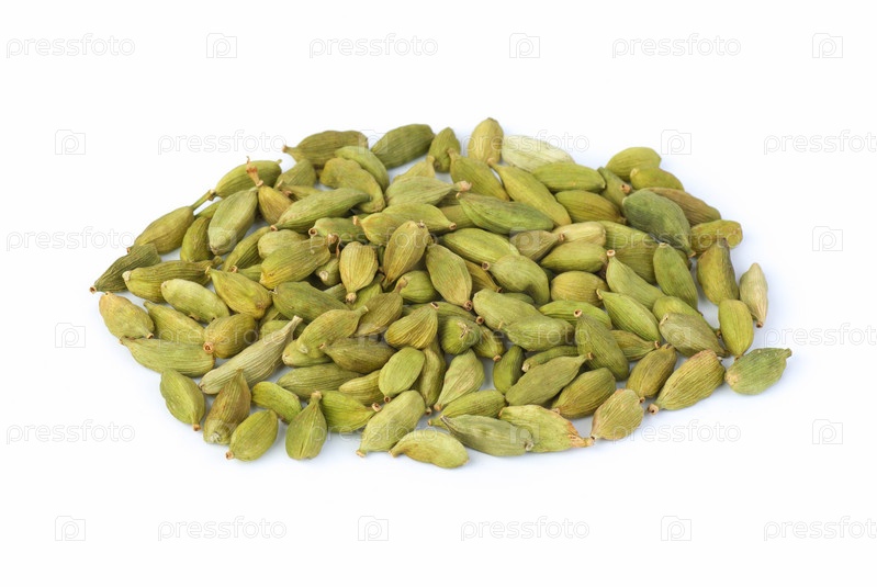 Специи: зерна зеленого кардамона на белом фоне