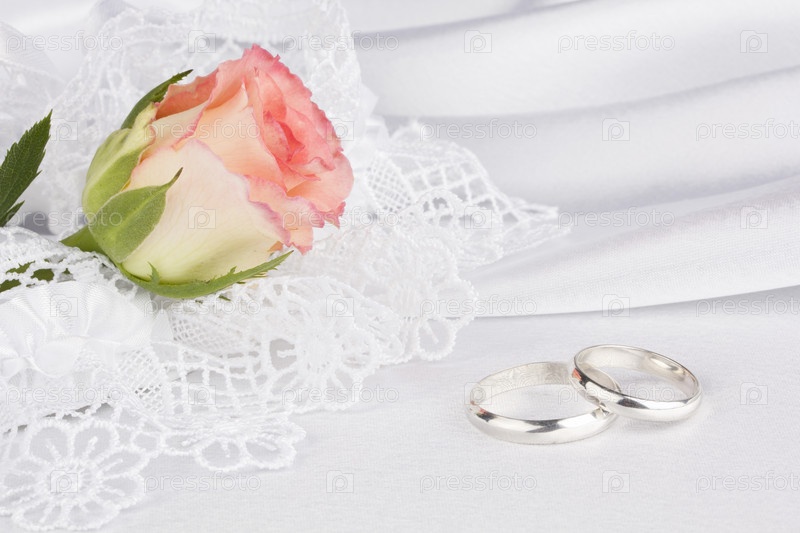 Красивая роза в белых кружевах и обручальные кольца на белом шелке