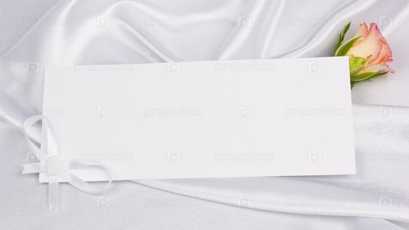 Пустая белая карточка с бантиком и цветком розы на белом шелке