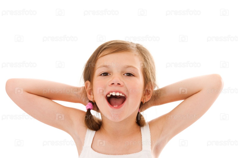 Портрет маленькой радостной девочки на белом фоне