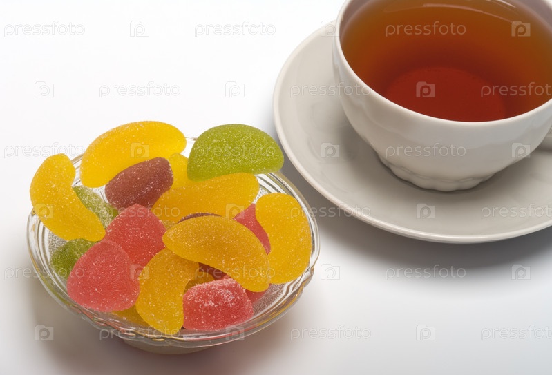 Фруктовые конфеты и чашка с чаем.Они изолированы на белом фоне