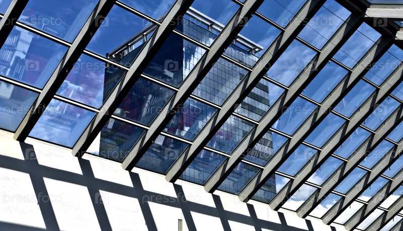 Современный небоскреб на фоне неба сквозь стеклянную крышу