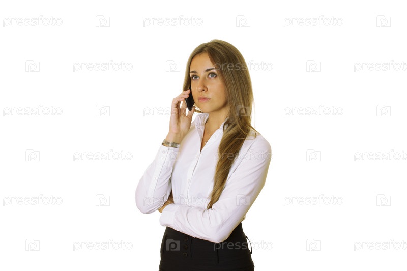 Молодая девушка разговаривает по телефону на белом фоне
