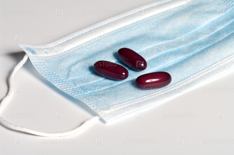 Три красных капсулы на медицинской маске