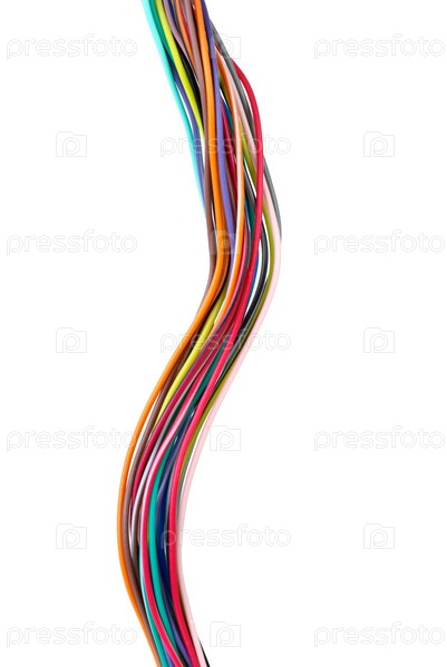 Изогнутый жгут разноцветных проводов. Изолировано на белом фоне