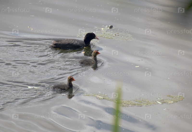 Лысуха бдительно сопровождает птенцов на пруду