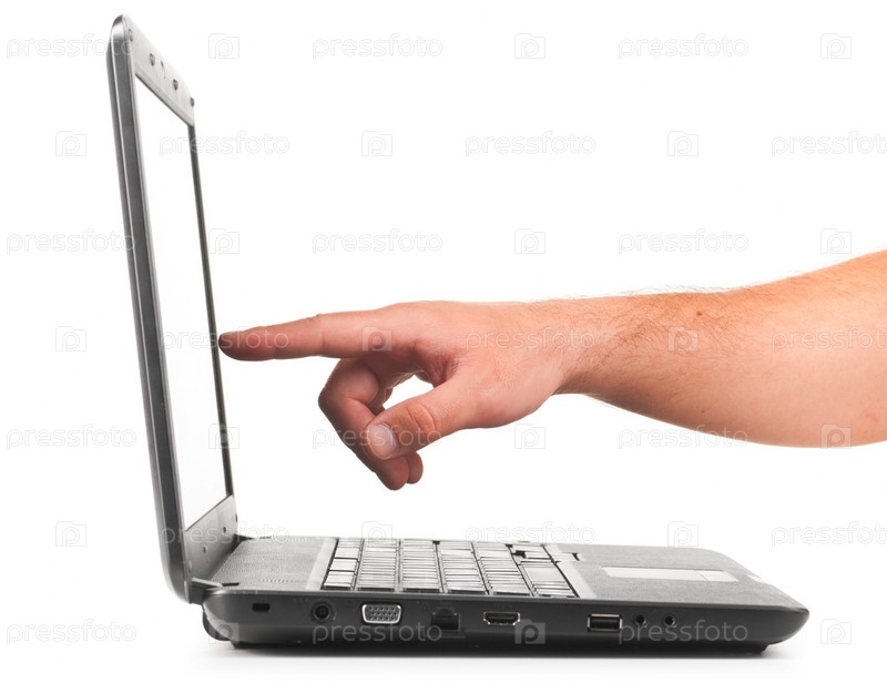 Мужская рука указывает на экран ноутбука, изолировано на белом