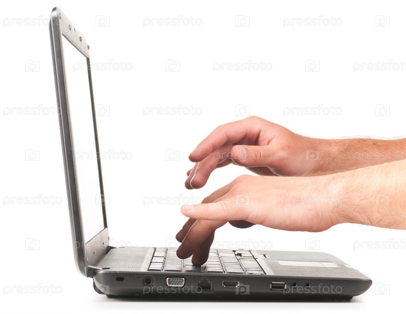 Мужчина работает на ноутбуке, крупный план, изолировано на белом