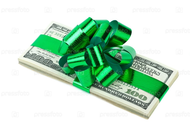 Пачка долларов, перевязанная лентой с бантом. Белый фон
