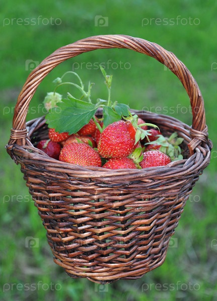 Плетеная корзина с клубникой на траве