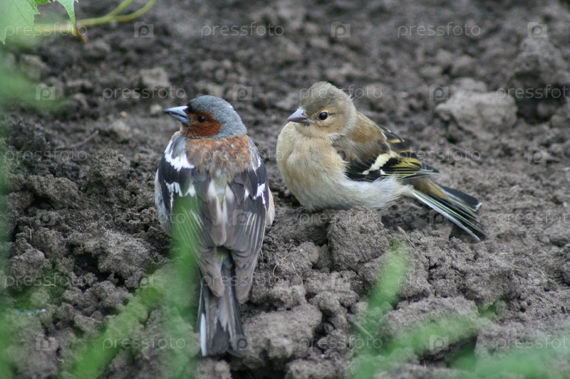 Зяблик и птенец зяблика сидят на земле