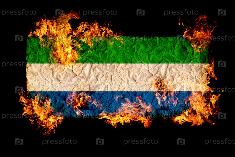 Флаг Сьерра-Леоне в огне на черном фоне