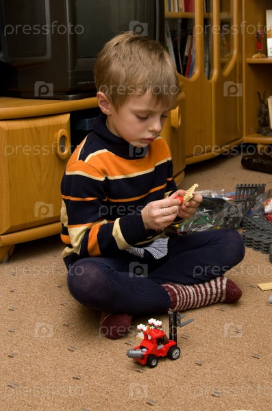Мальчик сидит на полу и играет в meccano