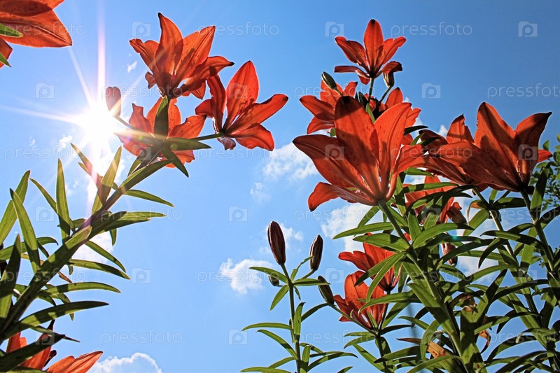 Цветущие красные лилии на фоне неба