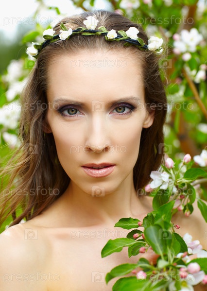 Женщина с красивой кожей и венком на голове возле цветущей яблони