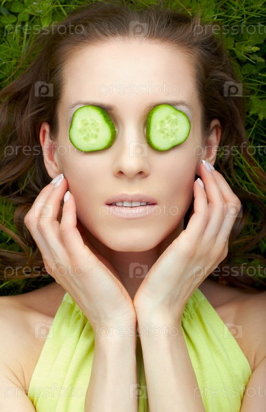 Женщина с красивой кожей лежит на траве с дольками огурца на глазах