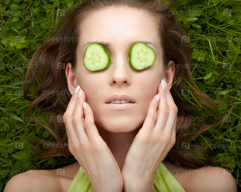 Женщина с красивой кожей лежит на траве с дольками огурца на глазах