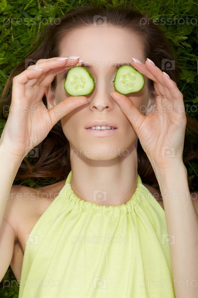 Женщина с красивой кожей лежит на траве с дольками огурца на глазах