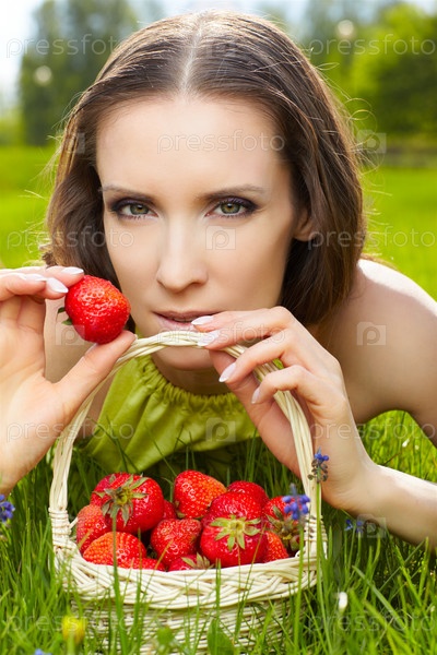 Красивая женщина лежит на траве с корзинкой клубники