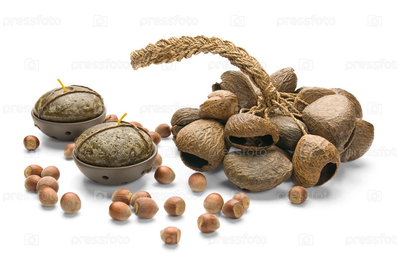 Натюрморты, этнические музыкальные инструменты, орехи и свечи, изолированные на белом фоне