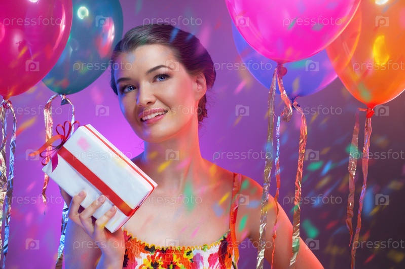 Красивая девушка с подарком в окружении разноцветных воздушных шаров