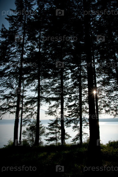 Силуэты деревьев на берегу высокогорного озера Зюраткуль, Южный Урал