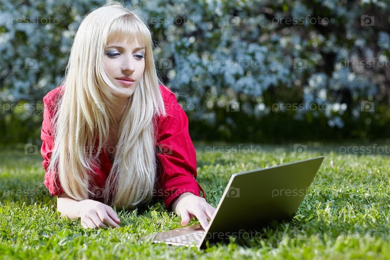 Портрет красивой блондинки с ноутбуком на природе