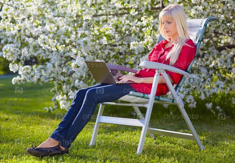 Портрет красивой блондинки, сидящей в кресле с ноутбуком на природе