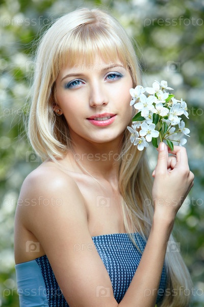 Портрет красивой голубоглазой блондинки с ароматными цветами яблони в руке