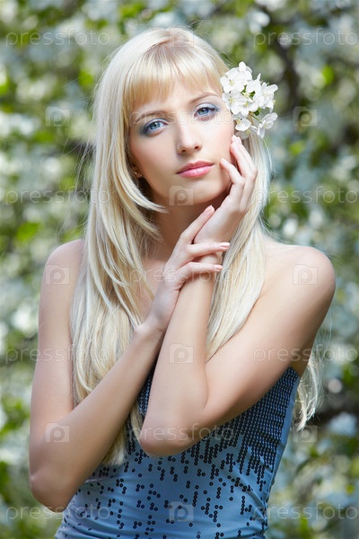 Портрет красивой голубоглазой блондинки с цветами яблони в волосах