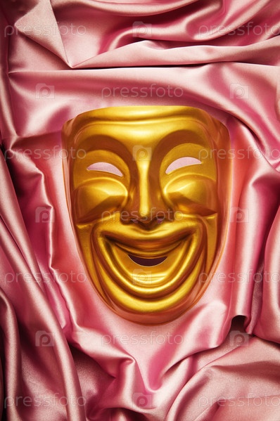 Веселая театральная маска на розовом атласе