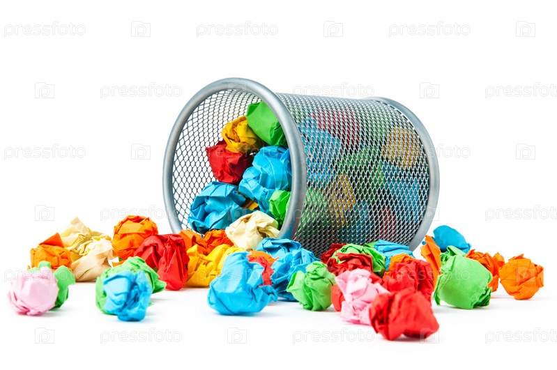 Опрокинутое ведро с мятой цветной бумагой на белом фоне