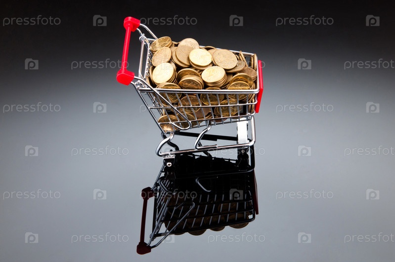 Тележка с монетами на сером фоне