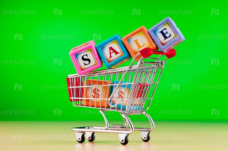Слово "Распродажа" из цветных кубиков в продуктовой тележке на зеленом фоне