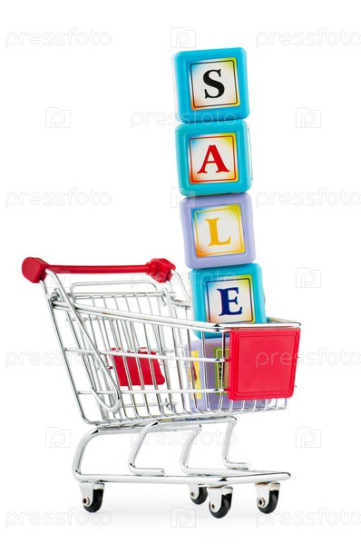 Слово "Распродажа" из цветных кубиков в продуктовой тележке на белом фоне