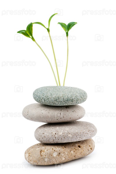 Зеленые саженцы в гальке на белом фоне