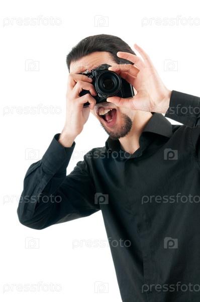 Молодой мужчина с фотоаппаратом на белом фоне