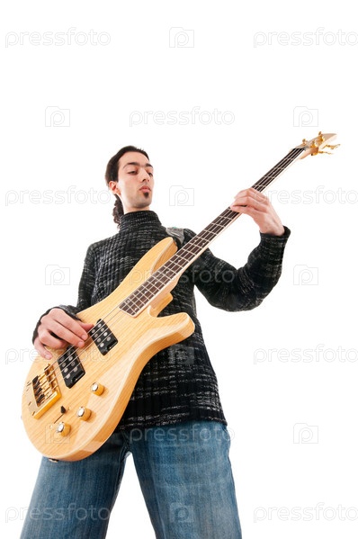 Молодой мужчина с гитарой на белом фоне