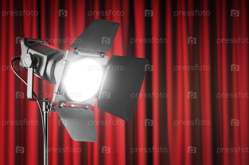 Прожектор на фоне красного занавеса