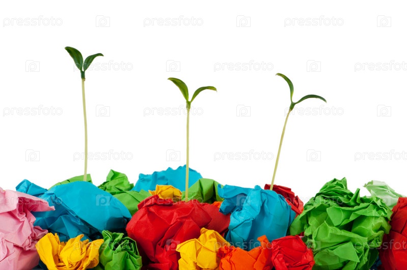 Зеленые ростки среди мятой цветной бумаги на белом фоне