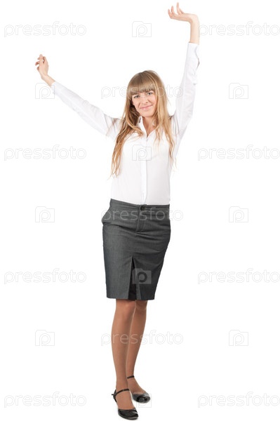 Успешная бизнес-леди радуется победе, подняв руки. Изолировано на белом фоне