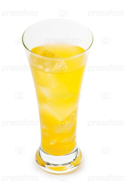 Желтый коктейль со льдом в бокале на белом фоне