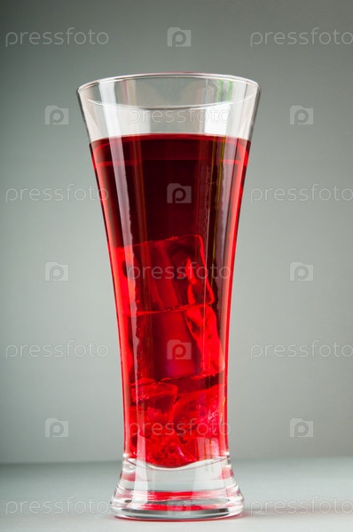 Красный коктейль со льдом в бокале на сером фоне