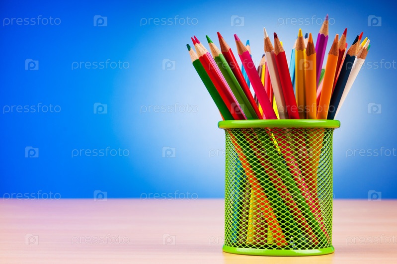 Цветные карандаши в подставке на голубом фоне