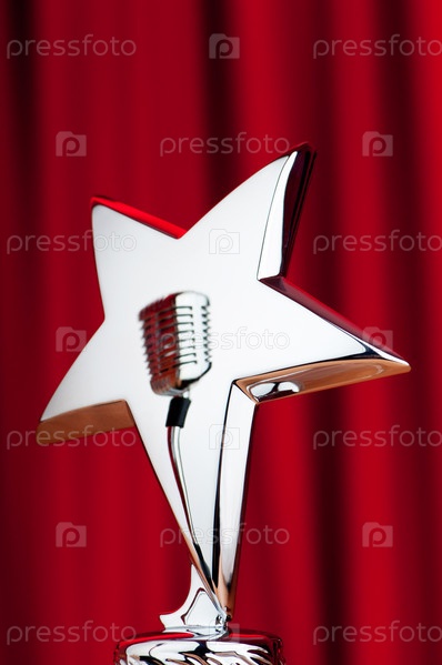 Награда в форме звезды с отражением микрофона на фоне красного занавеса